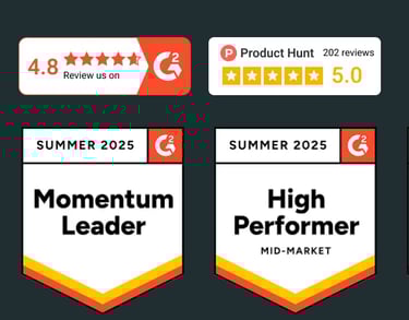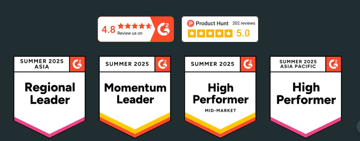 Thanks to your amazing reviews, we've been recognized as a Momentum Leader and a Regional Leader in Asia! ,High Performer - Mid-Market , High Performer - Asia Pacific We're also celebrating our perfect 5.0 rating on Product Hunt. Thank you for making us a top-rated choice for users worldwide!